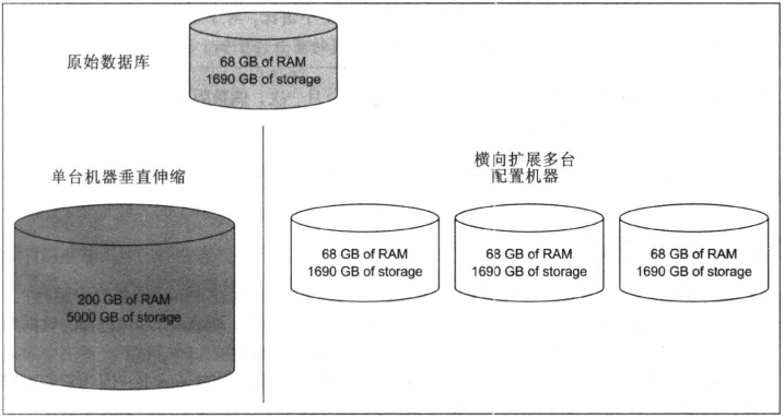 伸缩数据库的最简单方式是添加更快的硬盘、更多的内存以及更强的 CPU 来突破数据库性能瓶颈。提升单节点参数的做法通常也称垂直扩展。垂直扩展非常简单、可靠,但是最终我们会达到一个无法低成本垂直扩展的临界点。
