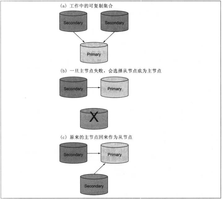MongoDB 提供了数据库复制特性,叫做可复制集合(replica set)。可复制集合在多个及其上分布式存储数据,在服务器或者网络出错时,实现数据冗余存储和自动灾备。此外,复制还用于伸缩数据库读操作。